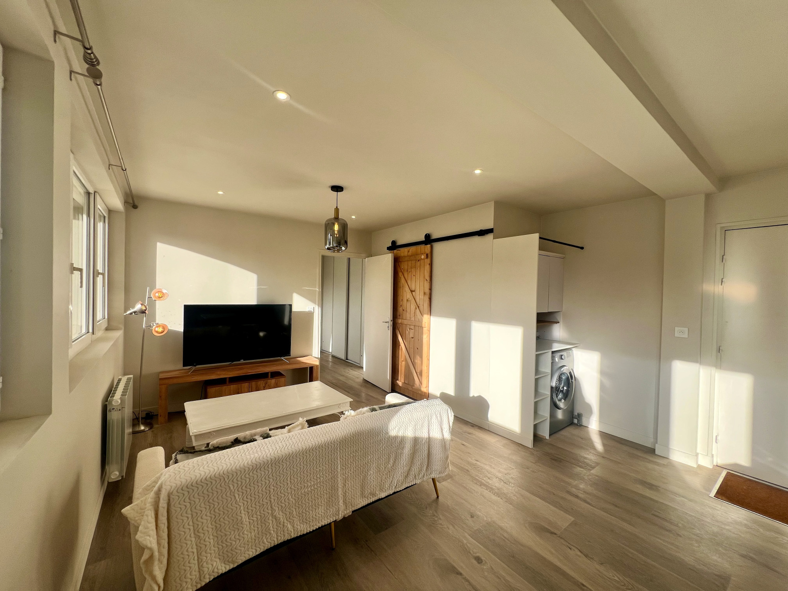Il comprend une entrée sur la pièce de vie avec séjour-salon et cuisine ouverte aménagée et équipée (meubles bas et hauts, four, plaque, hotte, lave-vaisselle, réfrigérateur/congélateur et une machine à laver), WC séparé, deux chambres avec dressing et une salle d'eau.