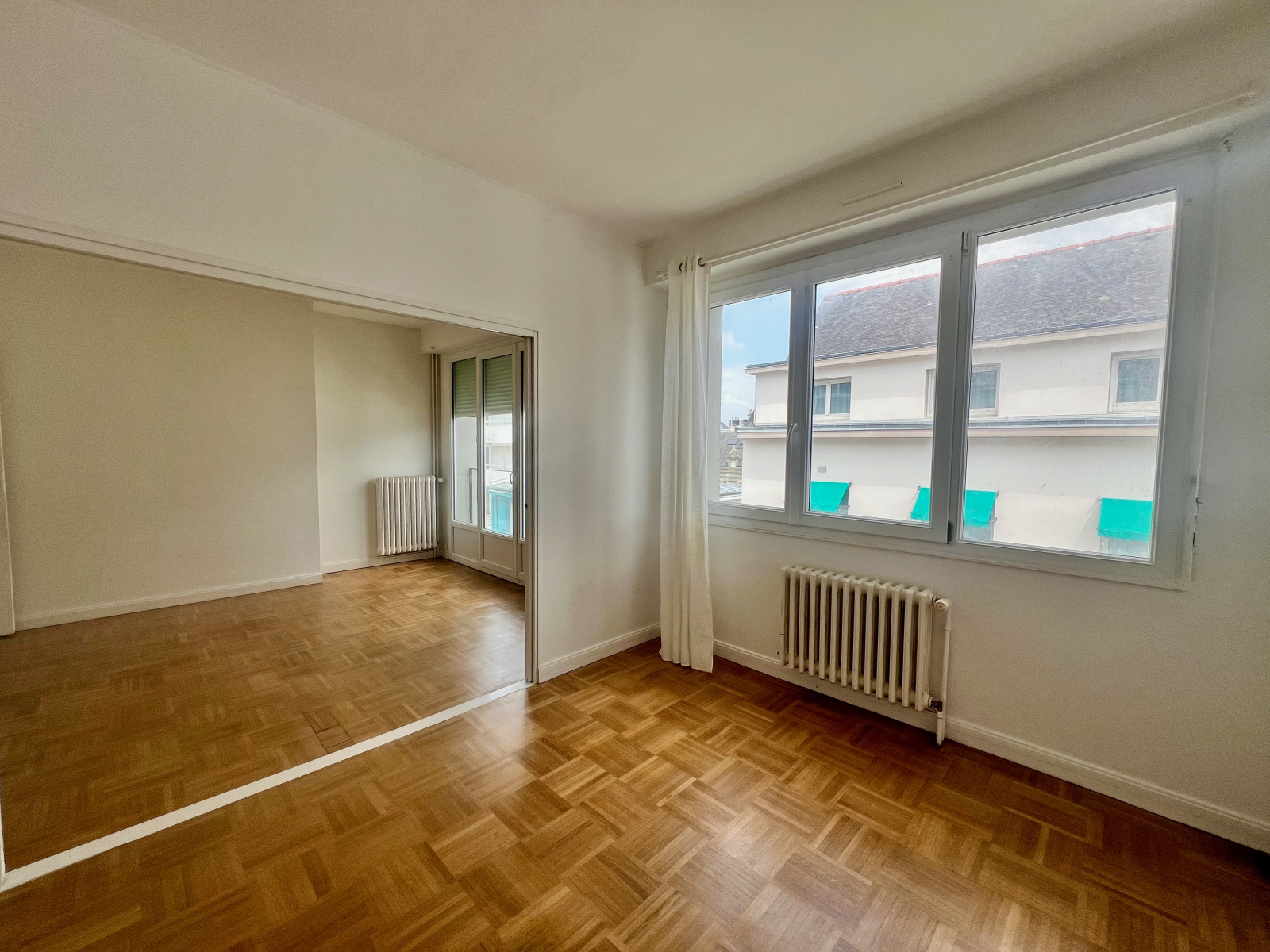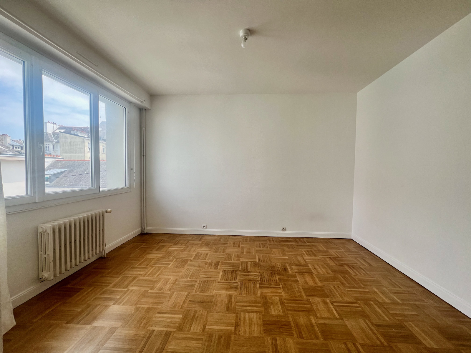 Dans un immeuble non meublé en centre-ville à Lorient, appartement situé au deuxième étage comprenant : une entrée avec placards, salon, salle à manger ou 2 ème chambres, cuisine aménagée et équipée (meubles bas et hauts, réfrigérateur-congélateur, four, plaque, hotte), 1 chambre, salle d'eau, WC séparé.