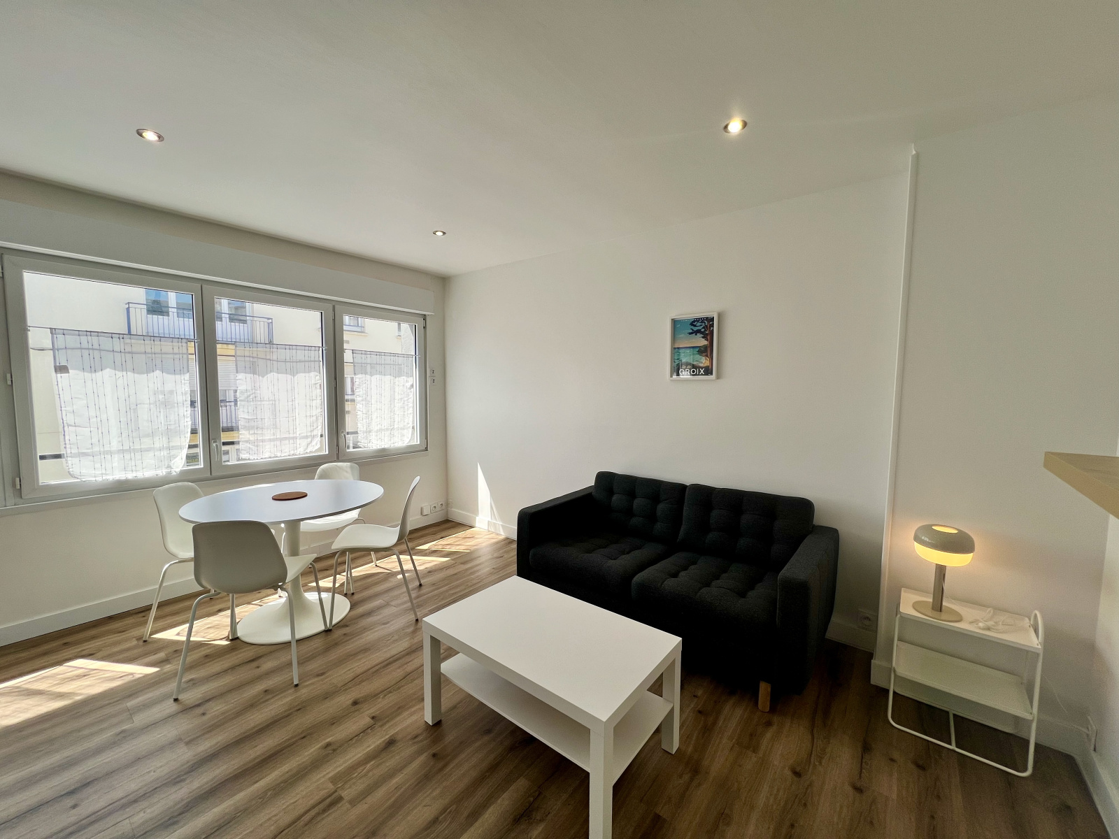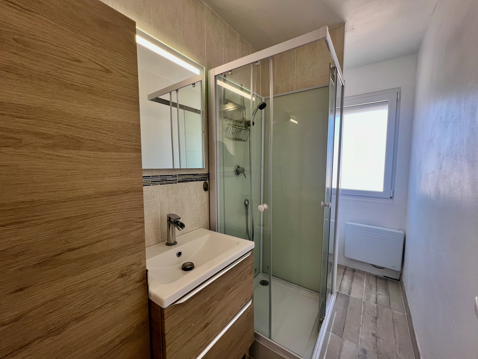 Dans une petite copropriété des années 60 et situé au deuxième et dernier étage : appartement de type 2 meublé comprenant une entrée avec placard, séjour-salon ouvert sur la cuisine aménagée et équipée (meubles bas et hauts, four, plaque, hotte, machine à laver, réfrigérateur/congélateur), chambre avec placard et une salle d'eau avec WC.