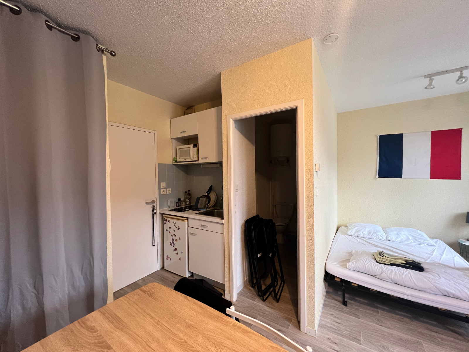 Il comprend une pièce à vivre avec kitchenette (meubles bas et haut, réfrigérateur, plaque vitrocéramique, micro-onde), salle d'eau avec WC.