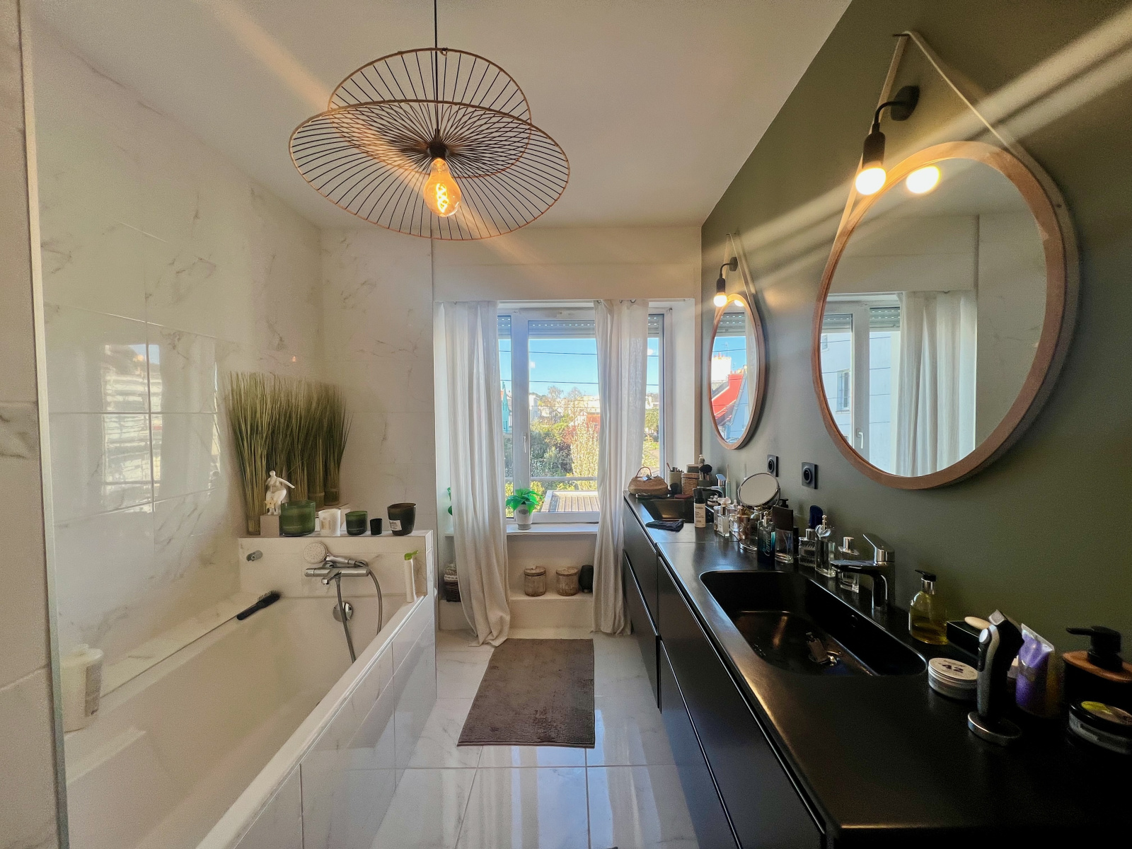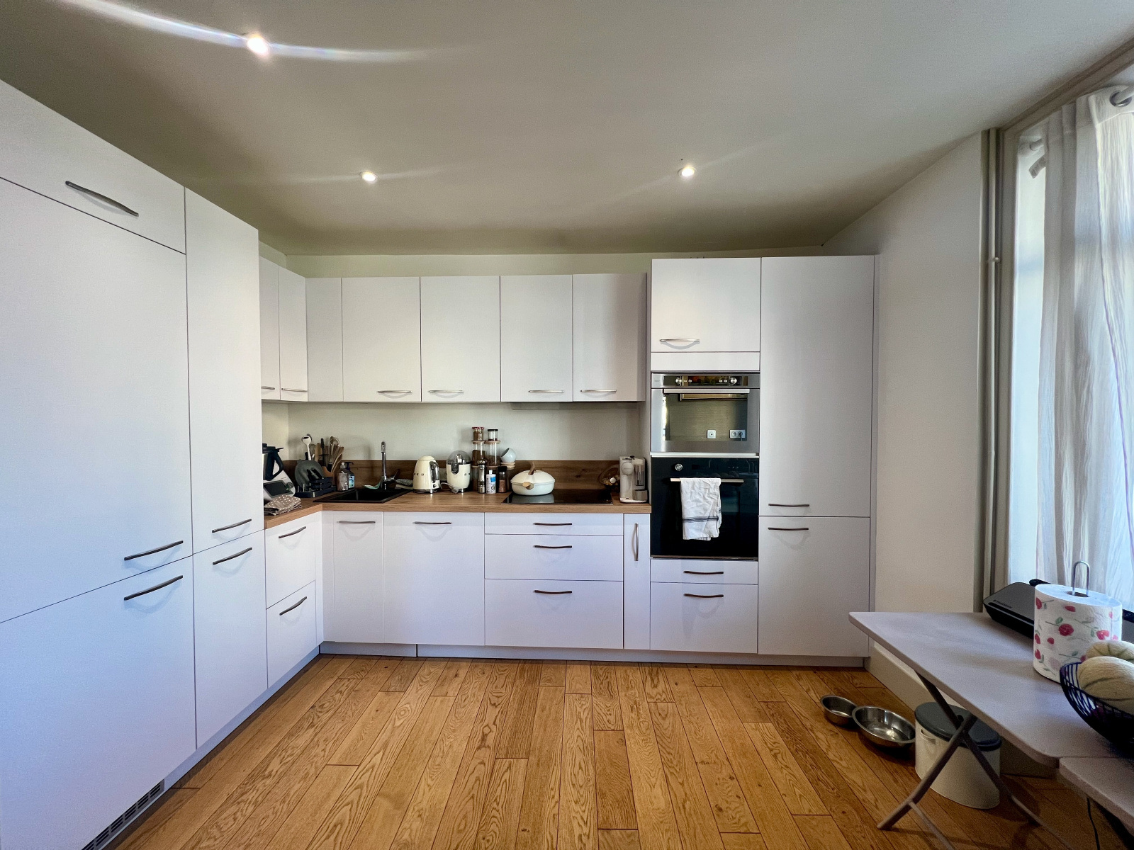 A l'étage vaste appartement en duplex de 130 m2 comprenant une agréable pièce de vie avec cuisine ouverte aménagée et équipée, arrière cuisine, WC séparé et 4 chambres avec placards et deux salle de bains.